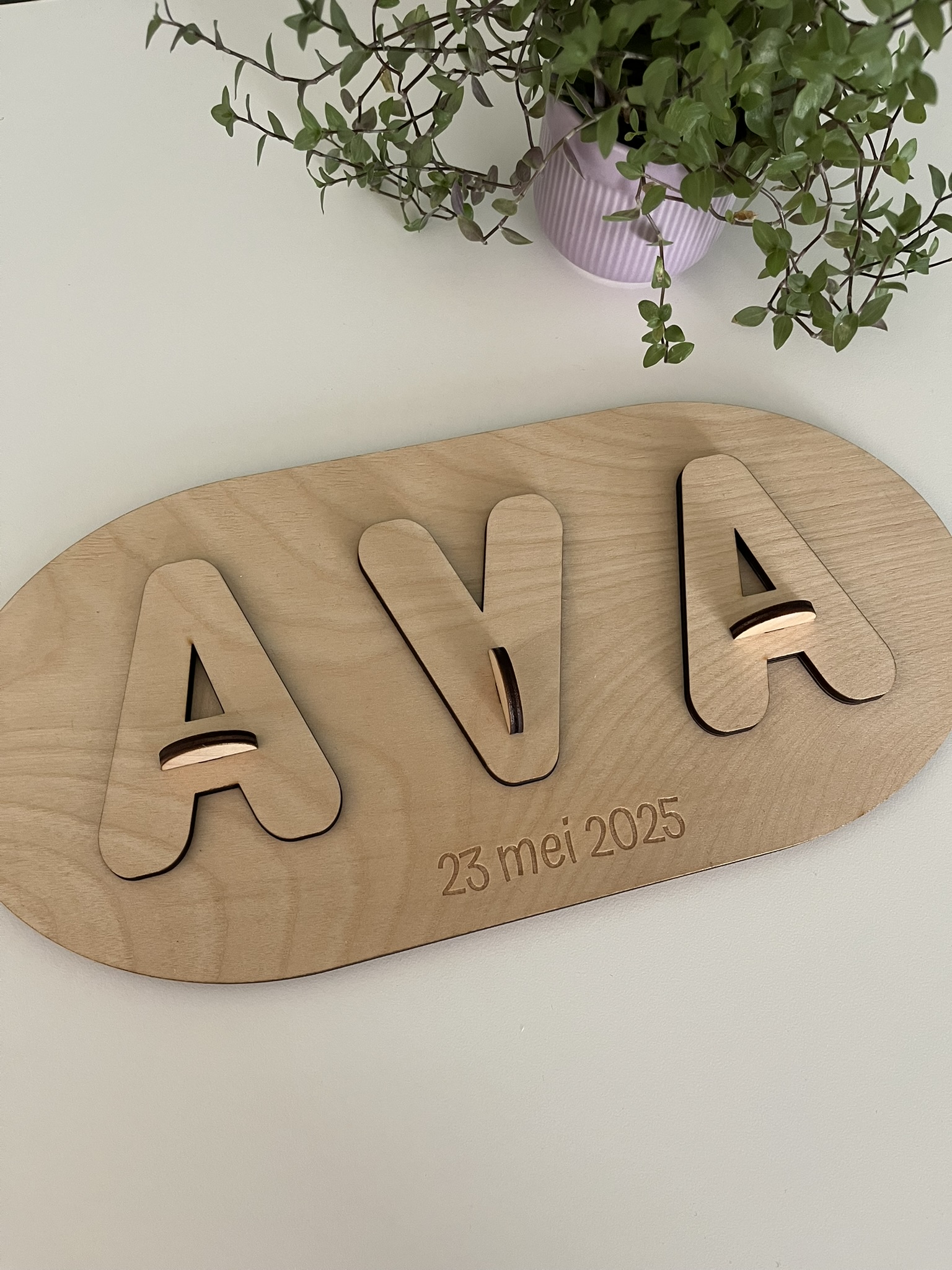 Deze mooie, houten naampuzzel is een uniek (kraam)kado.