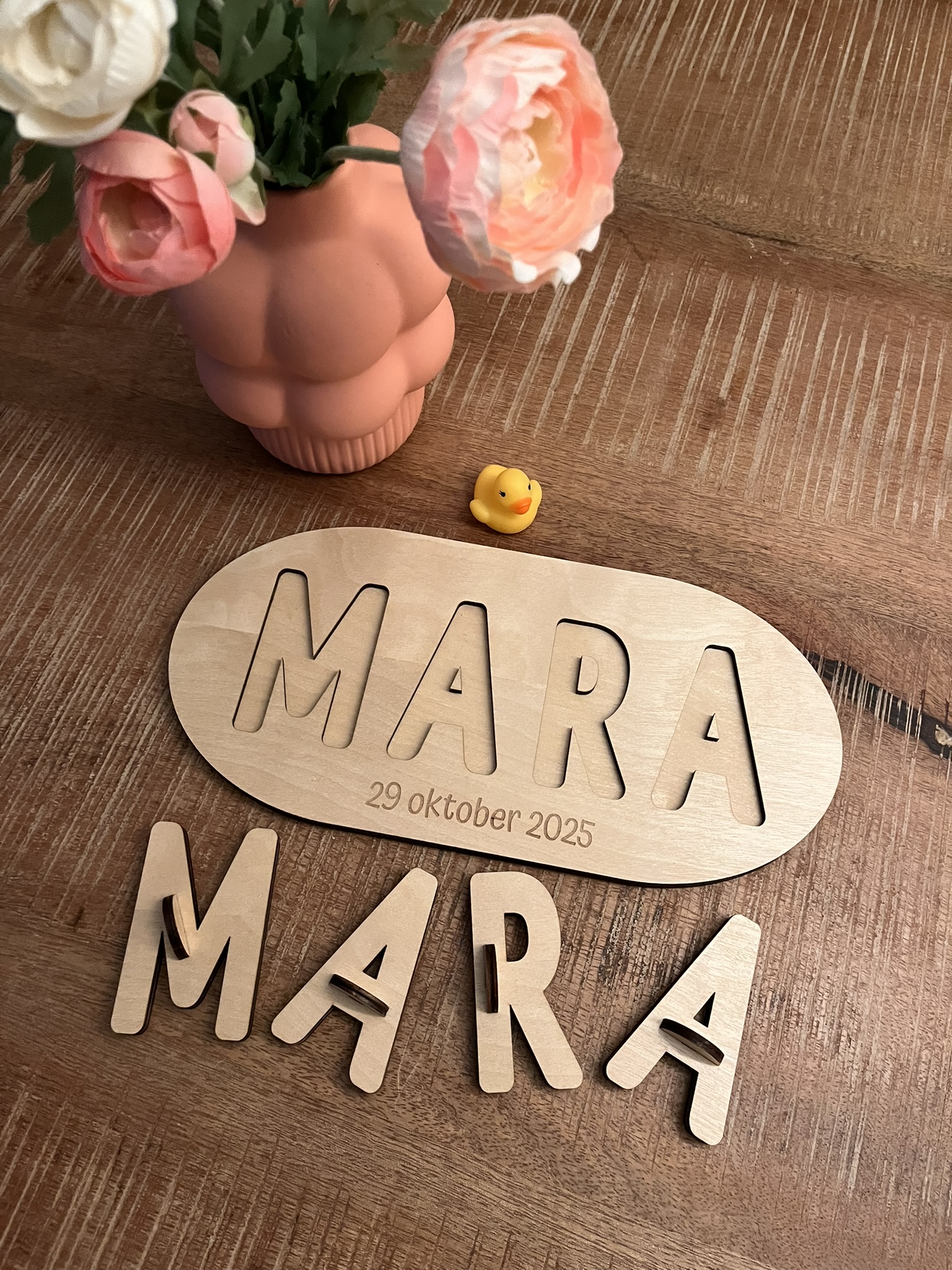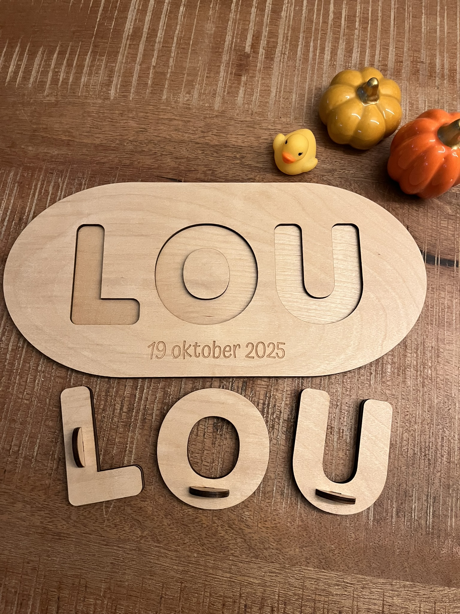De naampuzzel is afgelakt met speciale, kindvriendelijke blanke lak.